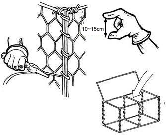 4、各個表面綁扎在一起。使用長度適宜的綁絲,首先綁扎在一頭,然后間隔10~15cm穿過網(wǎng)孔,進(jìn)行單圈、雙圈的交替纏繞。為了保證網(wǎng)面間的緊密結(jié)合,纏繞時要用力,拉緊。 隔板絞合時注意沿一條豎直線絞合,而且絞合后的隔板是在同一豎直面上。