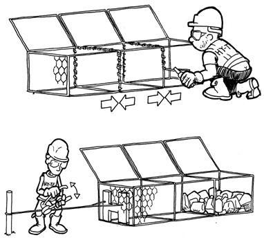 1、石籠網(wǎng),格賓網(wǎng)和雷諾護(hù)墊被運(yùn)到施工工地時,是若干個網(wǎng)箱被打成一大包。剪斷捆扎絲,取出所需的獨(dú)立的格賓網(wǎng)或雷諾護(hù)墊,綁絲也會同時提供,另由于網(wǎng)箱尺寸不同,有底蓋一體的,有底蓋分開的,查看標(biāo)簽說明即可。